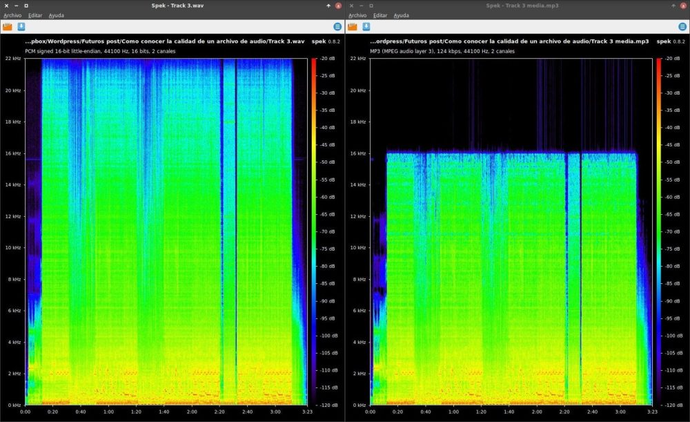 Si pasas ese archivo por un espectrograma (como Spek) y ves que la imagen se corta abruptamente en una línea horizontal a los 16 kHz o 20 kHz, te han engañado: es un MP3 inflado. Un archivo de alta resolución real llega hasta los 22 kHz o más con información fluida.